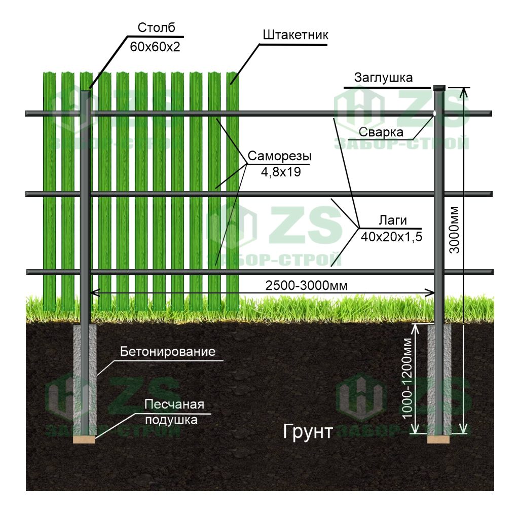 Конструкция забора из евроштакетника с бетонированием столбов: