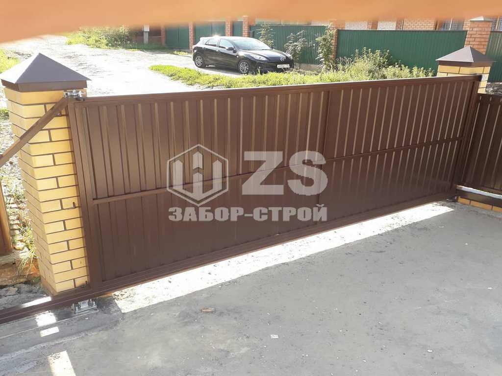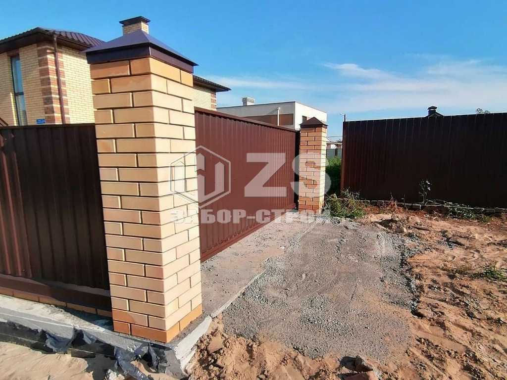 - Забор с кирпичными столбами из профнастила 15 метров