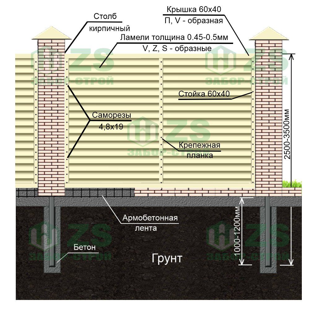 Конструкция забора жалюзи на ленточном фундаменте с кирпичными столбами:
