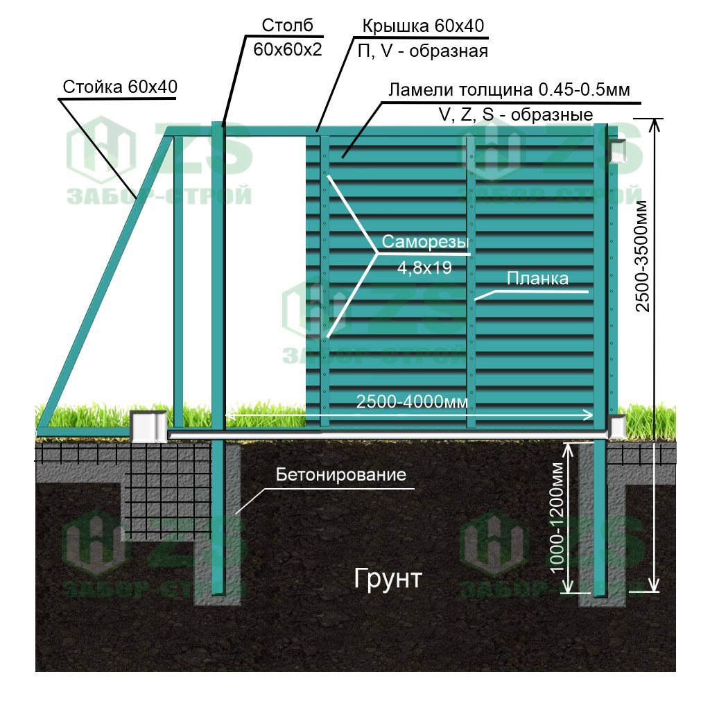 Конструкция забора жалюзи с бетонированием столбов: